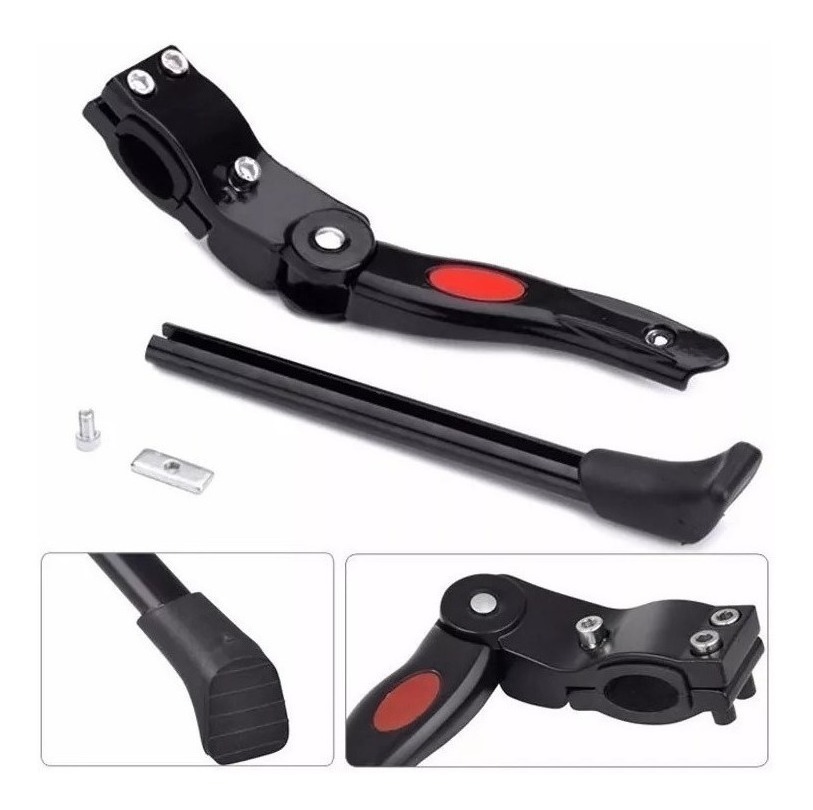 - Marca: HS - Apoio antiderrapante - Compatível com aros 20, 24, 26, 29 - À prova d'água e resistente ao tempo - Material: Liga de alumínio e emborrachado - Possui parafuso de ajuste de altura: - Estendido: 33cm - Fechado: 26cm - Peso: 280 gramas aproximadamente - 3 meses de garantia contra defeito de fabricação - Não indicado para bike motorizada.